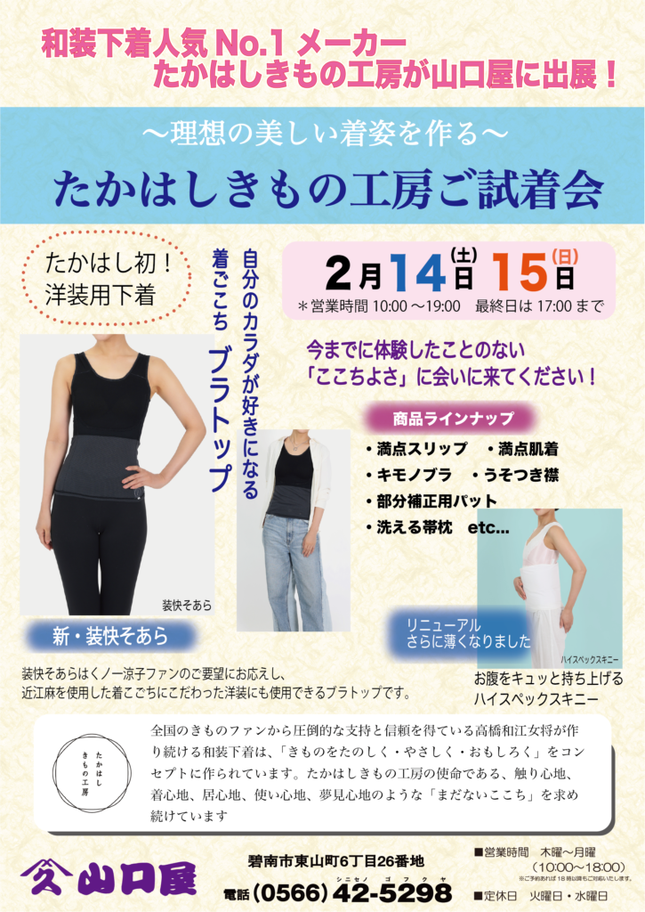 和装下着で圧倒的な支持を得ている「たかはしきもの工房」が山口屋にやってきます!