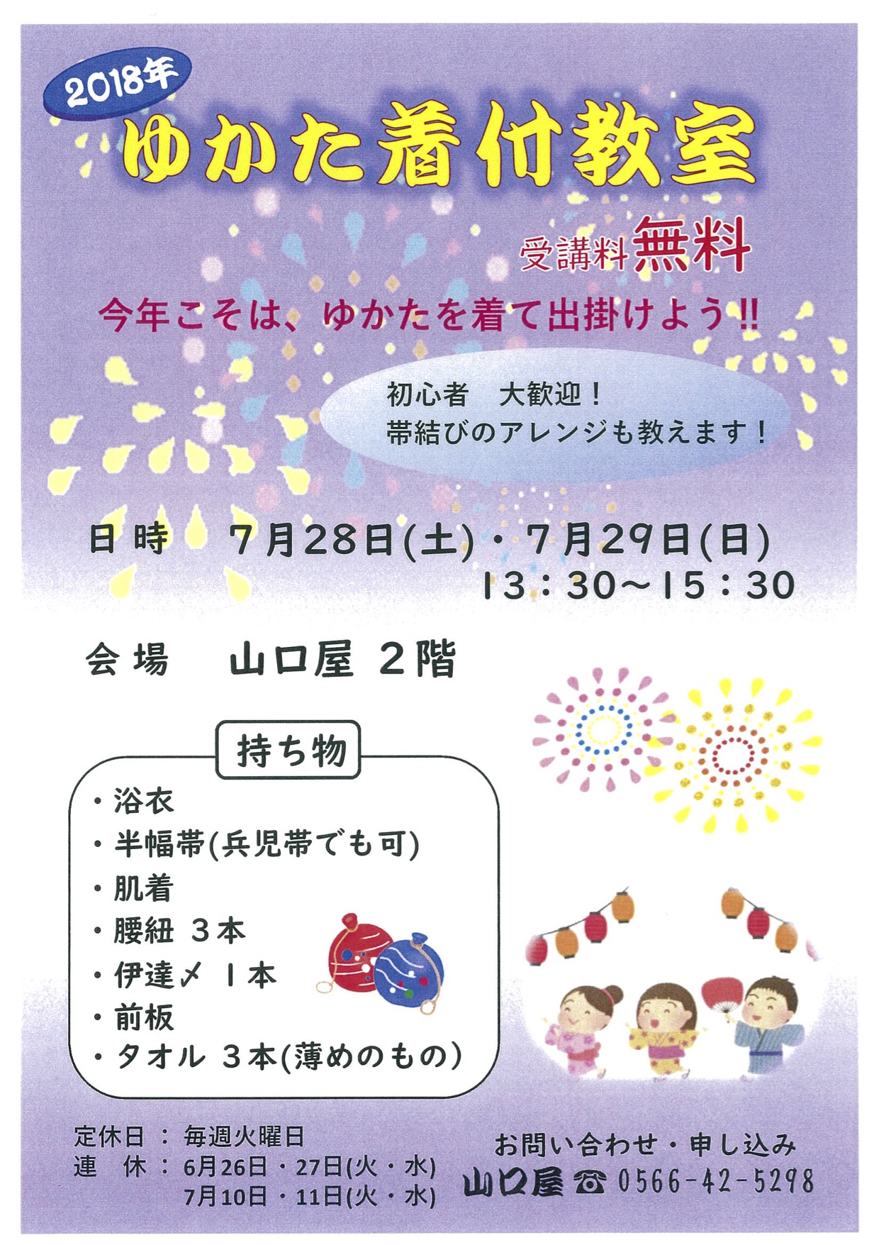 今年こそは自分でゆかたを着てお出かけしたい!そんな方々のご要望にお応えして山口屋では7月28日(土)と29日(日)の13:30〜15:30まで限定20名様にてゆかた無料着付け教室を行います!ちょうどその日は吉良や長良川、豊田で大きな花火大会も開催されます。ぜひとも奮ってご参加下さい!お問い合わせ、お申込みは当ページの来店予約からでも出来ます。(参加多数の場合は受付を締切る場合もございますので予めご了承下さい)
