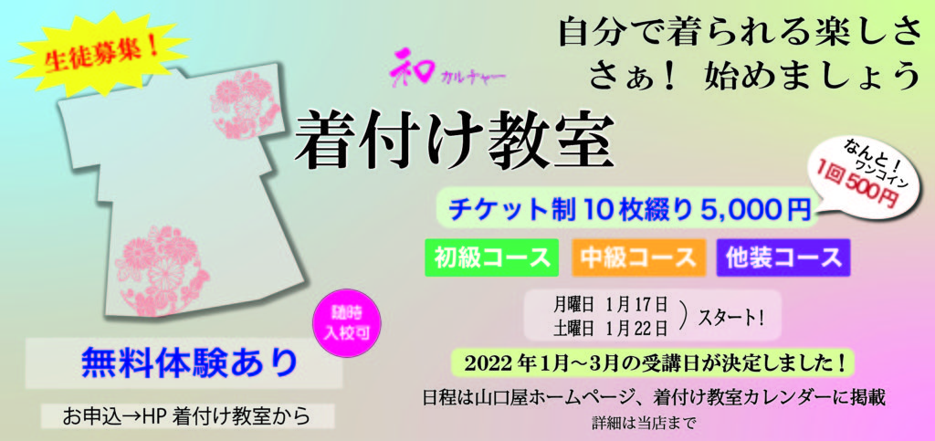 日程は山口屋ホームページ着付け教室の教室カレンダーに記載してます。