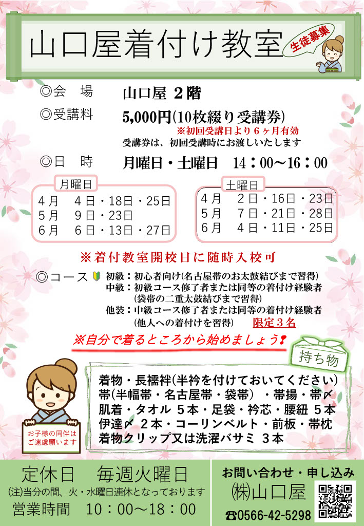 日程は山口屋ホームページ着付け教室の教室カレンダーに記載